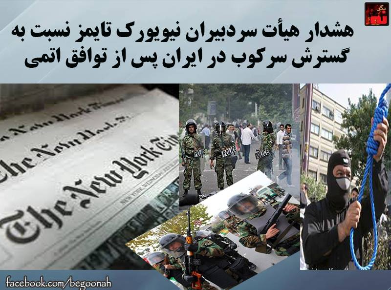 #بگونه : رژیم آخوندی پس از زهرخوری اتمی در وحشت از گسترش اعتراضات اجتماعی مردم به جان آمده، با سرکوب و ایجاد فضای اختناق بیشتر در جامعه و با اعدام زندانیان و دستگیری گسترده فعالان سیاسی می خواهد از یک قیام مردمی که هر لحظه میتواند شکل بگیرد را جلوگیری نماید.در این راستا هیأت سردبیران نیویورک تایمز روز جمعه 15آبان طی بیانیه ای با عنوان ”توافق اتمی و سپس سرکوب در ایران“ هشدار دادند پس از امضای برجام در ایران واکنش ضدآمریکایی و اقدامهای سرکوبگرانه توسط سپاه پاسداران افزایش یافته است.