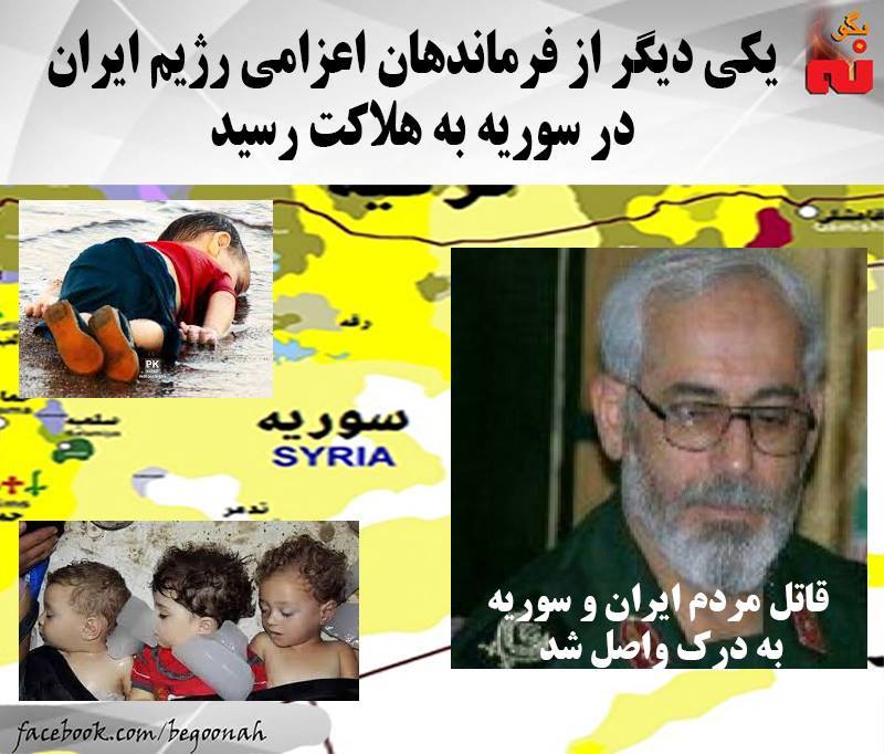 #بگونه: منابع خبری حکومتی رژیم ایران از به هلاکت رسیدن یکی از فرماندهان سپاه پاسداران بنام پاسدارعلی شالیکار در سوریه خبر دادند. همچنین سایت حکومتی رجا نیوز، با انتشار عکسی از پاسدار محمد حسین عزیز آبادی، در سوریه اذعان کرد که چهلمین پاسدار اعزامی به سوریه جهت کشتار مخالفان بشار اسد در این کشور به هلاکت رسیده است.