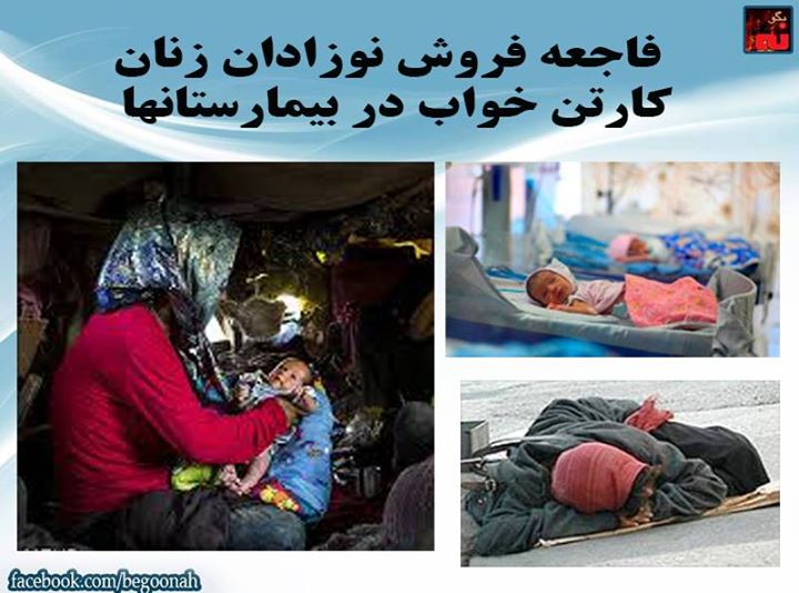#بگونه: فاجعه فروش نوزادان که اکثرا از مادرهای کارتن خواب و معتاد و دختران فراری به دنیا می آیند از دیگر رهآوردهای رژیم فاسد آخوندی برای جامعه ایران است که مردم این سرزمین ثروتمند را در فقر و کارتن خوابی و اعتیاد روسپي گري فرو برده است. در همین رابطه رییس کمیته اجتماعی شورای رژیم در شهر تهران در اعتراف تکان دهنده ای گفت که تعدادی از زنان «کارتنخواب و روسپی» نوزادان خود را پس از زایمان در برخی از بیمارستانهای «جنوب و مرکز شهر» به قیمت «۱۰۰ تا ۲۰۰ هزار تومان» میفروشند !