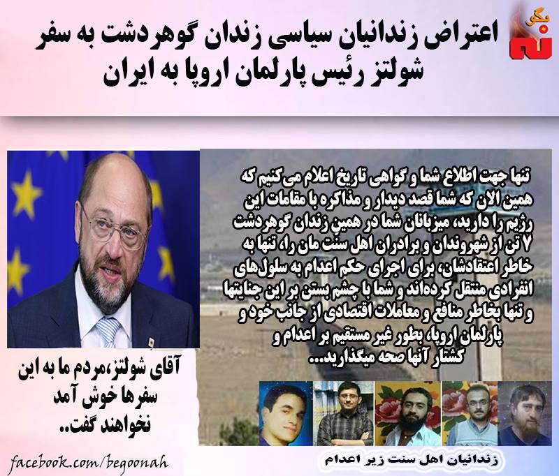 #بگونه : زندانيان سياسي زندان گوهردشت كرج طي نامه اي به سفر شولتر رئيس پارلمان اروپا به ايران اعتراض كردند. آنها در نامه خود با ياد آوري اعدام قریب الوقوع شماري از هم بندان خود نوشتند: