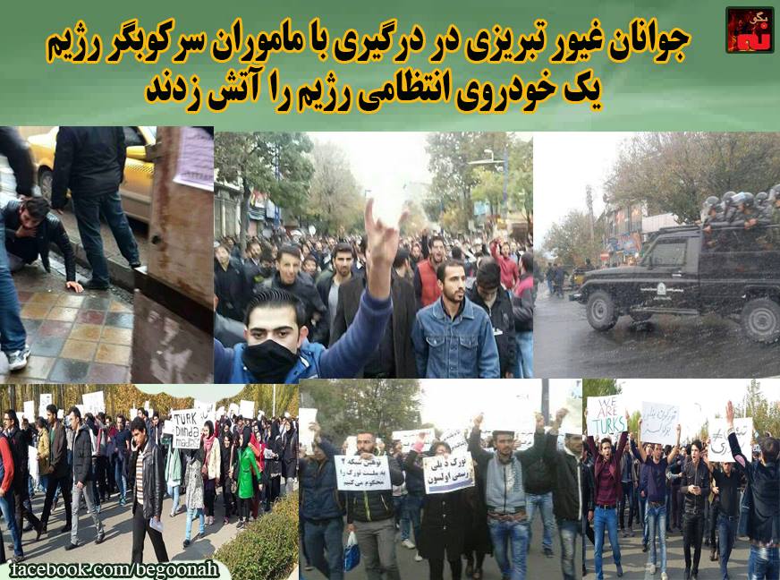 #بگونه: در پی اعتراض و تظاهرات خشمگینانه هموطنان ترک زبان شهرهای مختلف کشور نسبت به برنامه اهانت آمیز و رذیلانه فتیله به این هموطنان از سوی صدا و سیمای آخوندی رژیم، جوانان دلیر شهر تبریز در جریان تظاهرات روز گذشته، در فلکه ’قونقا باشی’ تبریز با مأموران سرکوبگر رژیم در این شهر درگیر شدند و یک خودرو آنها را به آتش کشیدند.