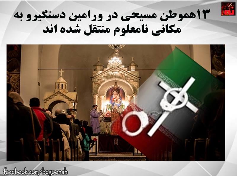 بنا بر خبر دریافتی ،یک هفته پیش در روز یکشنبه دهم آبان ،۱۳ هموطن مسیحی در ورامین ، حین برگزاری یک مراسم مذهبی در یک کلیسا دستگیر و به مکان نامعلومی منتقل شدند.تا این لحظه هیچ اطلاعی از اتهامات و محل نگهداری آنان در دست نیست.