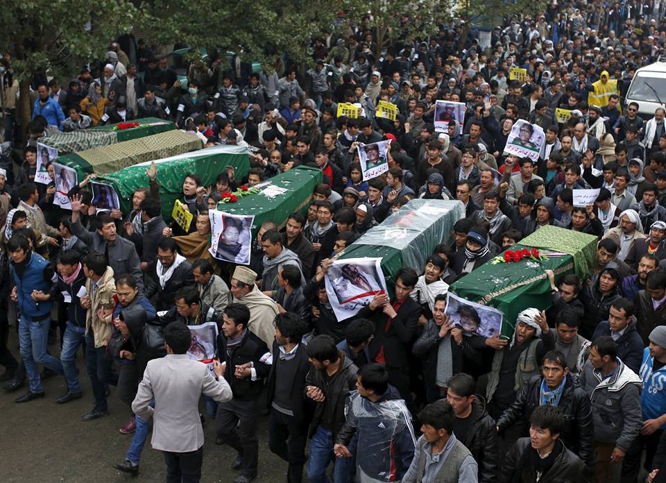 در تصاوير زنده ای كه از تلويزيونهاي محلى منتشر ميشود راهپيمايان تابوتها و تصاوير قربانيان، از جمله زنان و یک کودک را حمل مى كنند و مي گويند براى دادخواهى جلو ارگ رياست جمهورى آمده اند. راهپيمايان از دولت افغانستان انتقاد مى كنند كه براى رهايى گروگانهاى عمدتا هزاره كه چندى پيش در شاهراه كابل-قندهار ربوده شده بودند، اقدام نكرده است.