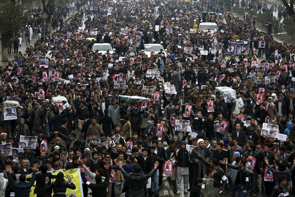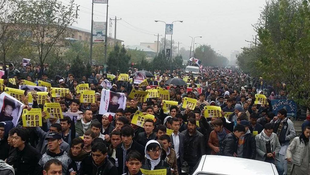 تظاهرکنندگان همراه با تابوت کشته شدگان وارد محوطه ارگ ریاست جمهوری شدند و از محمد اشرف غنی رئیس جمهوری افغانستان خواستند تا به مطالبات آنها پاسخ دهد.مراسم تشییع جنازه هفت گروگان هزاره که به دست اسلام گرایان افراطی سربریده شدند، به یک راهپیمایی اعتراضی بزرگ علیه دولت افغانستان بدل شد. صبح روز چهارشنبه هزاران نفر از مردمی که در شهر کابل در مراسم خاکسپاری آنها شرکت کرده بودند، در اعتراض به ناامنی در ولایات افغانستان، اجساد قربانیان را به مقابل دروازه های ارگ ریاست جمهوری این کشور منتقل کردند.