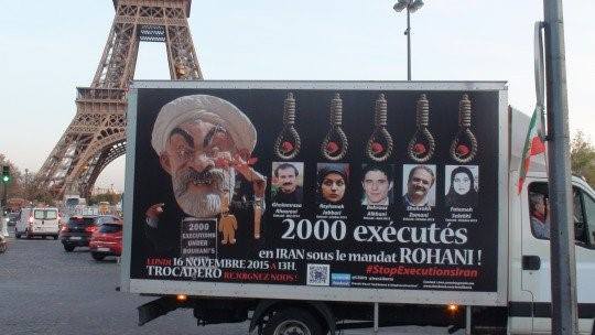 #بگونه: تصويري از ماشين تبليغي كمپين نه به روحاني در آستانه سفر وي به پاريس، در اين تصوير ماشيني كه از ميدان تروكادرو نزديك برج ايفل عبور مي كند، حاوي عكس هايي از تعدادي از اعدام شدگان در دوره رياست جمهوري آخوند روحاني است.