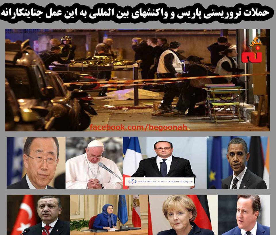 مريم رجوي در بيانيه خود خاطر نشان كرد كه ” مردم ایران كه 37 سال است تحت حاكميت سياه ديكتاتوري مذهبي و تروريستي آخوندي، يعني پدرخوانده داعش، قرار دارند با اين جنايتها به خوبي آشنا هستند و مردم فرانسه و احساساتشان را در اين لحظات سخت كاملاً درك ميكنند و با آنها همدرد هستند.”