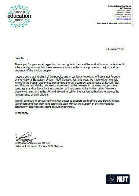 اینجانب، به شما اطمینان می دهم که وضعیت مردم و به ویژه معلمان ایران از سوی اتحادیه ملی آموزش و پرورش – بخش NUT ( اتحادیه ملی معلمین ) فراموش نشده است. فقط در همین سال، ما نامه های متعددی به مقامات ایرانی نوشته ایم که خواستار درمان عادلانه و آزادی اسماعیل عبدی و محمد حبیبی است، بیانیه ای را در مورد اعتراضات در ماه ژانویه منتشر کرده و کمپین ها و جمع آوری امضاء برای حمایت از حقوق اتحادیه های کارگری در کشور را نیز ترویج دادیم.