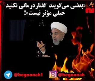 آخوند حسن روحانی رئیس جمهور نظام که صبح روز یکشنبه۲۲ مهر۹۷ در مراسم آغاز سال تحصیلی دانشگاهها و مراکز پژوهشی و فناوری طبق معمول دروغ می بافت و یاوه گویی هایش مورد اعتراض باندهای حکومتی قرار گرفته که روضه نخوانید جواب مشکلات را بدهیددر جواب آنها گفت: «بعضی میگویند گفتاردرمانی نکنید. بله، گفتاردرمانی خیلی مؤثر نیست اما امیددرمانی مؤثر است. امروز در جامعه نیاز به امید به فردا داریم.»
