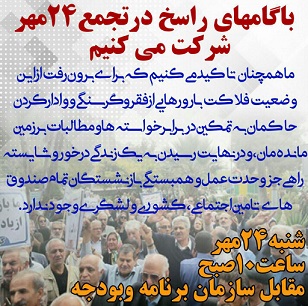 فراخوان بازنشستگان به تجمع سه شنبه ۲۴ مهر ۹۷ ساعت ۱۰ صبح مقابل سازمان برنامه و بودجه