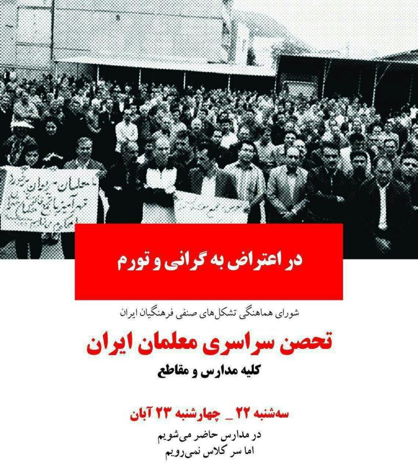 شورای هماهنگی تشکلهای صنفی فرهنگیان ایران به دلیل بیتوجهی مسئولان به مطالبات فرهنگیان و اعتراضات مدنی آنها، مخصوصا تحصن گستردهی مهرماه، به تمام فرهنگیان ایران مجدد فراخوان میدهد در روزهای سهشنبه و چهارشنبه ۲۲ و ۲۳ آبان ضمن حضور در مدرسه از رفتن به کلاسها خودداری و در دفتر مدارس تحصن کنند.