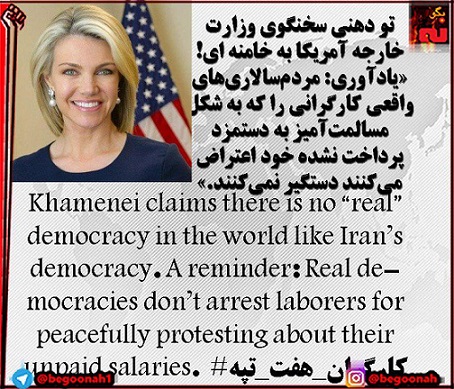هدر نائورت سخنگوی وزارت خارجه آمریکا در یک تودهنی به خامنه ای در صفحه توئیتر خود به یاوه گویی های وی واکنش نشان داد و در حمایت از کارگران هفت تپه نوشت: «خامنهای ادعا میکند که هیچ مردمسالاریای در دنیا مانند مردمسالاری در ایران واقعی نیست.» «یادآوری: مردمسالاریهای واقعی کارگرانی را که به شکل مسالمتآمیز به دستمزد پرداخت نشده خود اعتراض میکنند دستگیر نمیکنند.»