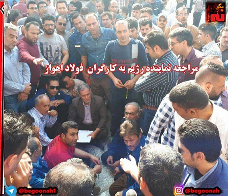 پس از گذشت ۱۱ روز از اعتراض و تظاهرات کارگران زحمتکش گروه ملی فولاد اهواز، امروز مدیر بیمه بیکاری خوزستان فردی بنام یاوری، به کارگران مراجعه نمود تا پاسخ مشکل بیمه های پرداخت نشده آنان را بدهد. کارگران در برابر وی گفتند ما سخنران نمیخواهیم گفتار درمانی زیاد شنیدیم و به حرفهای وی گوش ندادند. کارگران به این نماینده رژیم گفتند مثل ما کارگران باید روی زمین نشسته و حرفهای ما را گوش کنی. ما برای زن و بچه هایمان نان میخواهیم این حرفها برای ما نان نمی شود. ما کارگر هستیم چرا تلویویزیون به ما ارازل و اوباش گفته است؟ ما حقوقمان را میخواهیم و صدقه بگیر نیستیم. ما تا زمانی که حقوقمان را بگیریم می ایستیم.