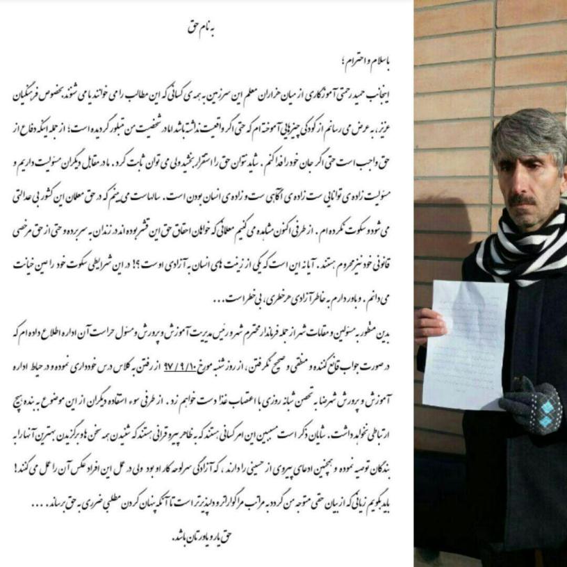 حمید رحمتی عضو کانون شهررضا اصفهان در حمایت از معلمان زندانی و در محکومیت ادامه بازداشت ها از امروز روزشنبه 10 آذرماه 97 در اداره اموزش و پرورش این شهر به اعتصاب خشک روی آورده است.