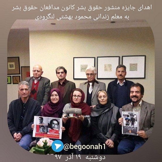این جایزه عصر امروز (۱۹آذر ۹۷) در مراسمی در منزل محمود بهشتی لنگرودی با حضور عبدالفتاح سلطانی، سیدمحمد سیف زاده و محمدعلی جداری فروغی از اعضای کانون مدافعان حقوق بشر و محمد فلاحی دبیرکل کانون صنفی معلمان ایران، عزیز قاسمزاده سخنگوی کانون صنفی فرهنگیان گیلان و جمعی از فعالان صنفی از سوی دکتر عبدالفتاح سلطانی به «آدینه بیگی» همسر محمود بهشتی لنگرودی اهدا شد.