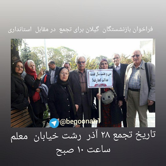 فراخوان بازنشستگان گیلان برای تجمع مقابل استانداری چهارشنبه 28- آذر ساعت ۱۰صبح درمقابل استانداری گیلان – رشت -خیابان معلم