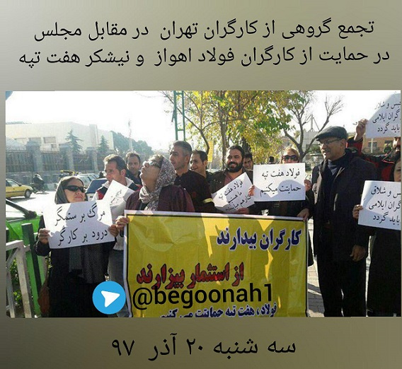 روز سه شنبه ۲۰ آذر۹۷ جمعی از کارگران تهران در حمایت از کارگران گروه ملی صنعتی فولاداهواز و کارگران نیشکر هفت تپه در مقابل مجلس ارتجاع تجمع کردند.