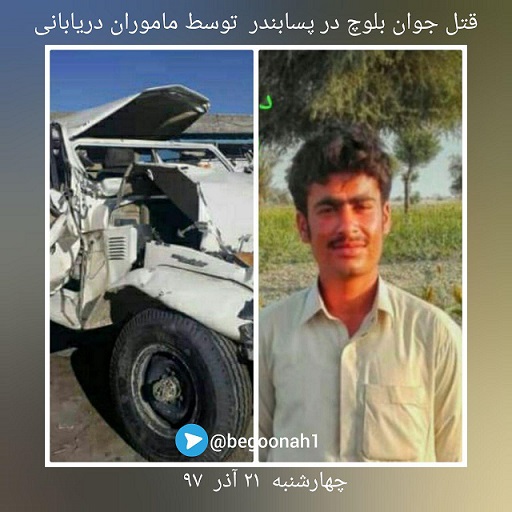قتل یک جوان بلوچ در پسابندر توسط ماموران دریا بانی صبح روز چهارشنبه ۲۱آذر۹۷ لیاقت بشکار فرزند حسن ۲۰ ساله با تعقیب و گریز نیروی دریابانی پسابندر واقع در استان سیستان بلوچستان و شلیک به طرف اتومبیل وی از مسیر منحرف شده و در اثر شدت جراحات فوت میکند.