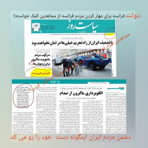 «این روزها که شاهد تظلمخواهی و عدالتخواهی مردم فرانسه علیه سردمداران لیبرال هستیم و داد مردم مظلوم بلند شده است، این روزها که… خبر رسیده… فرانسه برای مهار مردم از گروهک تروریستی منافقین کمک خواسته و از آنها برای بازداشت و ضرب و شتم مردم استفاده میکند.