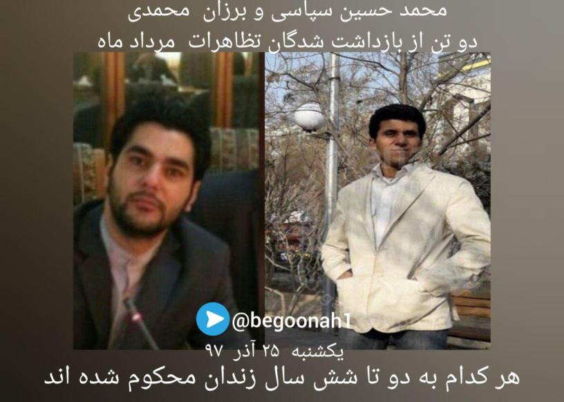 محمد حسین سپاسی ۲۹ ساله و برزان محمدی، کارگر ۴۰ ساله کرد دو تن از بازداشت شدگان تظاهرات مرداد ماه سال جاری، آنها از سوی قاضی صلواتی هر کدام به ۲ و ۶ سال زندان محکوم شدند و هم اکنون در زندان تهران بزرگ محبوس میباشند.