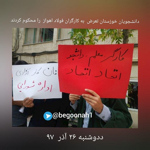 دانشجویان خوزستان امروز دوشنبه ۲۶آذر ۹۷ با ابراز انزجار از دستگیری و بازداشت کارگران پیامی در حمایت از کارگران فرستاده اند. دانشجویان استان خوزستان حمایت خود را از کارگران اعلام کرده و گفتند هرگونه تعرض به کارگران فولاد را اهواز را محکوم می کنند و خواهان آزادی بی قید و شرط همه کارگران هستند.
