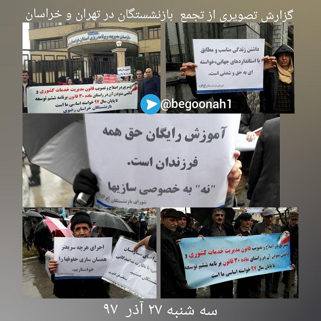 روز سهشنبه ۲۷ آذر ماه ۹۷ بازنشستگان تهران و خراسان رضوی در اعتراض به وضعیت معیشتی و پایین بودن حقوقهایشان مقابل ساختمان مجلس رژیم و سازمان برنامه و بودجه در مشهد تجمع کردند.
