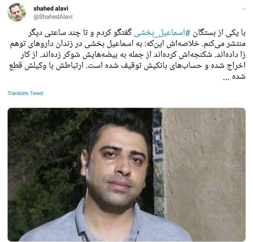شاهد علوی یک روزنامه نگار ایرانی مقیم امریکا است که صفحه توییتر خود نوشته است:با یکی از بستگان اسماعیل بخشی گفتگو کردم و تا چند ساعتی دیگر منتشر میکنم. خلاصهاش اینکه: به اسماعیل بخشی در زندان داروهای توهم زا دادهاند. شکنجهاش کردهاند از جمله به بیضههایش شوکر زدهاند. از کار اخراج شده و حسابهای بانکیش توقیف شده است. ارتباطش با وکیلش قطع شده است