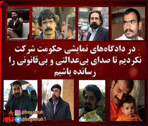 حکومت جمهوری اسلامی که ماهیتش بر سرکوب بنا شده است برای ظاهرالصلاح جلوهکردن، دادگاههایی را ترتیب میدهد که صدر تا ذیل آن یک نمایش فریبنده بیش نیست و انتظار دارد کسانی که به گواه تاریخ و اسناد میباید در جایگاه شاکی باشند در جایگاه متهم ظاهر شوند و لغویات قاضی را که از سوی مقامات امنیتی دیکته شده است دربست بپذیرند.