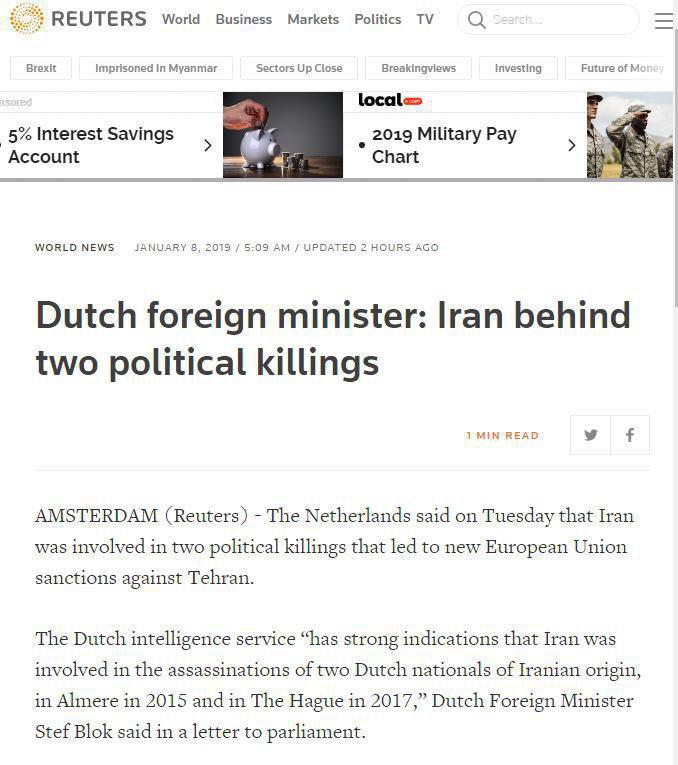 خبرگزاری رویترز – ۸ ژانویه ۲۰۱۹ – ۱۸ دی ۹۷ : هلند روز سه شنبه گفت ایران در ارتکاب دو قتل سیاسی دخیل بوده که منجر به تحریم های اتحادیه اروپا علیه تهران شده است.