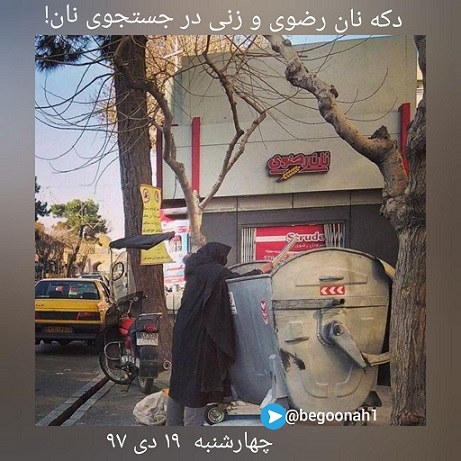 اینجا خراسان و آستان قدس رضوی است. (حرم امام رضا هشتمین امام شیعیان که نان دانی آخوندها و منجمله خامنه ای و نماینده اش آخوند علم الهدی است.) در اینجا که یک امپراطوری مالی است. زنی در برابر دکه نان رضوی در جستجوی نان درسطل زباله است! این امپراطوری مالی ضمن بهرهمندی از بودجه،درسال فقط ۱۰۰ هزار تومان مالیات میدهد.