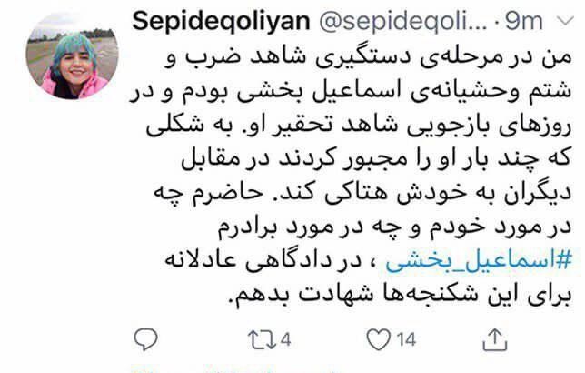 به شکلی که چند بار او را مجبور کردند در مقابل دیگران به خودش هتاکی کند. حاضرم چه در مورد خودم و چه در مورد برادرم اسماعیل بخشی ، در دادگاه عادلانه برای این شکنجهها شهادت بدهم.