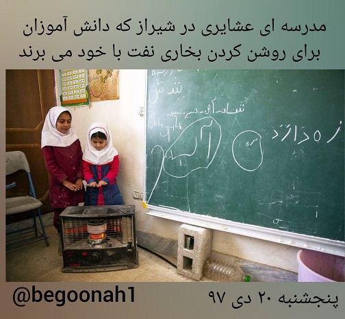 تلخ است اما خواندنی و شنیدنی! چرا؟ درک وتجربه مشترک همه ما ایرانی ها پاسخی مشترک برای این موضوع دارد. در ایران نفت خیز چرا باید دانش آموزان یک مدرسه هر روز صبح یک بطری نفت برای روشن کردن بخاری و گرم کردن کلاسشان با خود ببرند؟! دلیلش را می دانیم اما ببینیم داستان چیست.«مجتمع دام» یکی از مناطق حاشیه شیراز است که یک مدرسه عشایری در آن واقع شده هر یک از 90 دانشآموز این مدرسه یک بطری با خود به همراه دارد که هر روز صبح از خانه نفت برای بخاری نفتی کلاس شان میآورند. این در حالی است که حکومت آخوندها سالانه یک میلیون نفت مجانی به حکومت سوریه چه در دوره حافظ است و چه در دوره بشار اسد داده و همچنان می دهند. اما راه حل چیست؟ راه حل بستگی به این دارد ما در کجا هستیم و چه وظایفی باید برای خود در قبال سرنوشت خود و میهنمان قائل باشیم. اعتصاب و اعتراض و قیام وظیفه هر ایرانی و همه افشار جامعه است . ایرانیان خارج در حمایت از قیام می توانندنقشی چشمگیر داشته باشند.