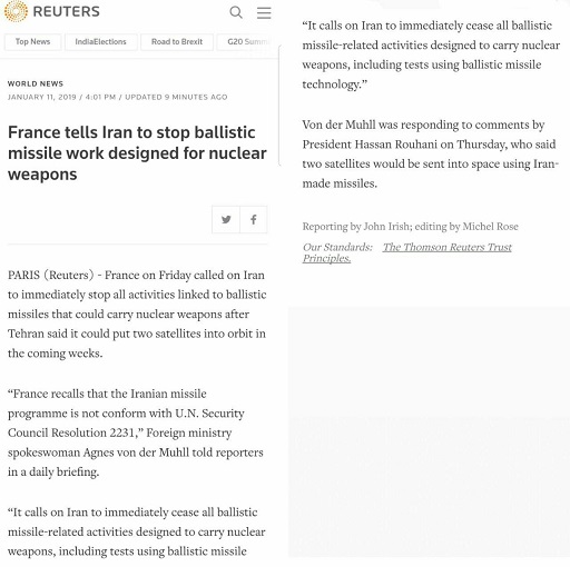 در پی سخنان آخوند حسن روحانی که اعلام کرد ظرف یکی دو هفته آینده دو موشک ماهواره ای به فضا فرستاده میشود فرانسه خواستار توقف برنامه موشکهای بالستیک رژیم ایران شد.