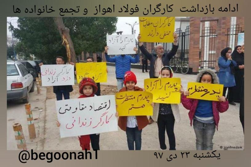 این تجمع روز شنبه ۲۲ دی ماه ۹۷ از سوی کارگران و خانواده های کارگران بازداشتی در مقابل دادگاه انقلاب اهواز ب گزار شد و تجمع کنندگان خواهان آزادی کارگران بازداشتی