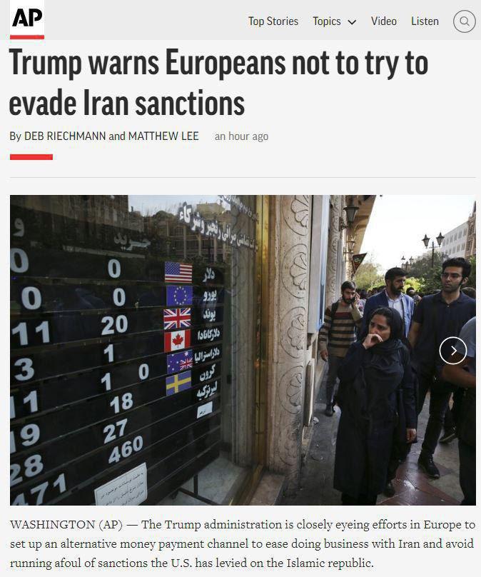 آسوشیتدپرس – ۸ بهمن ۹۷: دولت آمریکا از نزدیک تلاشهای اروپا برای برقرار کردن سازوکار ویژه برای تجارت با(رژیم) ایران و دور زدن تحریمهای آمریکا را تحت نظر دارد….