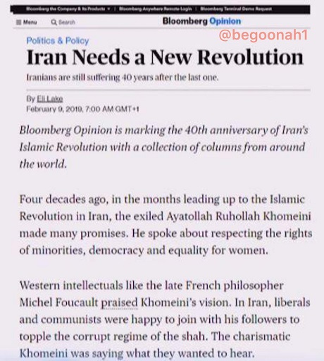 خبرگزاری بلومبرگ طی مقاله ای با عنوان ایران به انقلاب جدید نیاز دارد، نوشت: «چهار دهه پیش، خمینی در تبعید، وعده های بسیاری داد. اما وقتی خود را ولیفقیه معرفی کرد تمام وعده هایش را زیر پا گذاشت. در سال ۶۷ اعدامهای گستردهای صورت گرفت.این شقاوت به ایرانیانی که در خارج زندگی میکردند گسترش یافت. کمترین کاری که آمریکاییها و اروپاییها میتوانند بکنند این است که از مبارزه مردم ایران برای یک انقلاب دموکراتیک حمایت کنند.
