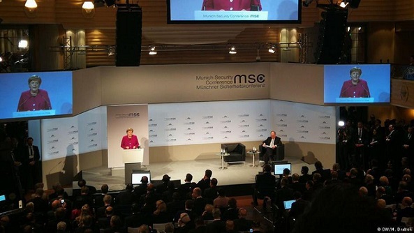 آنگلا مرکل روز شنبه ۱۶ فوریه (۲۷ بهمن) در نطق خود در کنفرانس امنیتی مونیخ تأکید کرد که آمریکا و اروپا در منطقه خاورمیانه در واقع هدف یکسانی را دنبال میکنند و آن «مهار نقش زیانبار» ایران است. رادیو آلمان