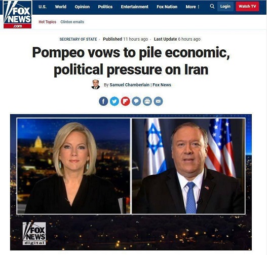 مایک پمپئو وزیر خارجه آمریکا: ایالات متحده، فشار مالی و سیاسی علیه رژیم دیکتاتوری مذهبی در ایران که خواهان گسترش نفوذش در سراسر خاورمیانه است را افزایش خواهد داد.