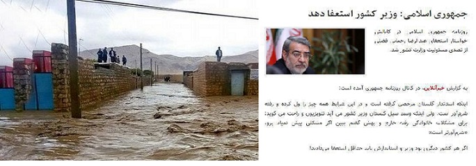 دولت روحانی با برکناری یک استاندار میخواهد خشم و نارضایتی مردم را کاهش دهد که با افشاگری استاندار برکنار شده در باره کارگزاران حکومتی که مردم را سیل زده را به حال خود رها کرده اند و مشغول تفریح و خوشگذرانی هستند، خشم نفرت مردم فزونتر خواهد شد و این حقیقت را بیش از پیش نمایان می کند که راهی جز برانداختن این نظام فاسد وجود ندارد. هموطنان تا ایران بیش از این ویران نشود و ایرانی بیش از این گرفتار فقر و فلاکت نگردد بپاخیزید. این تنها راه نجات ایران و ایرانی است.