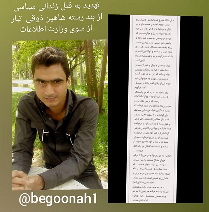 در این رابطه شاهین ذوقی تبار که یک زندانی از بند رسته هوادار سازمان مجاهدین خلق ایران است در صفحه توییتر نوشته اند:برای اطلاع عموم مینویسم وزارت اطلاعات مرتب من را تهدید میکند که در صورت عدم همکاری من را به صورت یک صحنه سازی به قتل میرساند اعلام میکنم هر اتفاقی به هر صورتی برای من بیفته مقصر اصلی رژیم و وزارت اطلاعاتش هست…در نوشته ی عکس توضیح کامل دادم. پنجشنبه ۸ فروردین ۹۸