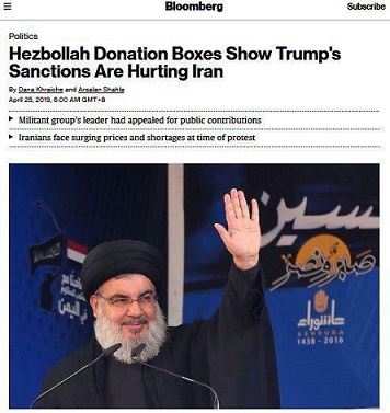یک ماه بعد از اینکه مایک پومپئو در نشست آیپک گفت «این که حسن نصرالله کاسه گدایی به دست گرفته، خبر خوبی است»، خبرگزاری بلومبرگ میگوید: تروریستهای حزبالله لبنان در سایه فشارهای مالی و تحریمها علیه این گروه و حامی اصلی مالیاش،رژيم ایران، صندوقهای دریافت کمک مالی و صدقه را در معابر عمومی نصب کرده است. روی این صندوقها نوشته شده: «به حمایت عمومی نیاز داریم.»