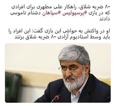 مطهری نایب رئیس مجلس وحوش درخواست زدن ۸۰ ضربه شلاق برای تماشاگران فوتبال در استادیوم به خاطر اعتراض کرده است.