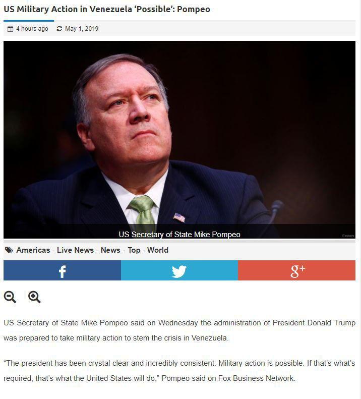 در این رابطه مایک پومپئو در یک مصاحبه تلویزیونی گفت: «رئیسجمهور آمریکا بسیار شفاف و محکم بوده است. اقدام نظامی محتمل است. اگر لازم باشد، ایالات متحده آن را انجام خواهد داد».