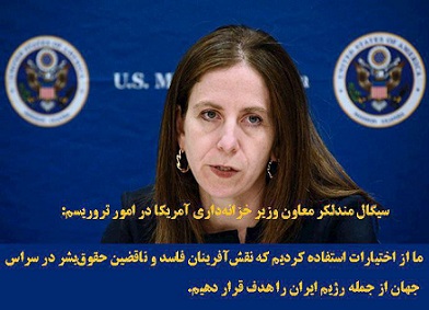 روز سهشنبه ۱۰ اردیبهشت ۹۸ سیگال مندلکر معاون وزیر خزانهداری در امور تروریسم و اطلاعات مالی گفت: ما از اختیارات استفاده کردیم که نقشآفرینان فاسد و ناقض کنندگان حقوق بشر در سراسر جهان از جمله رژیم ایران را هدف قرار دهیم