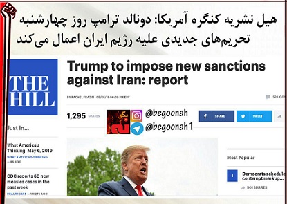 هیل نشریه کنگره آمریکا دوشنبه ۱۶اردیبهشت درباره تحریمهای جدید علیه رژیم ایران نوشت: انتظار میرود دولت دونالد ترامپ در هفته آتی تحریمهای جدیدی علیه رژیم ایران اعمال کند.