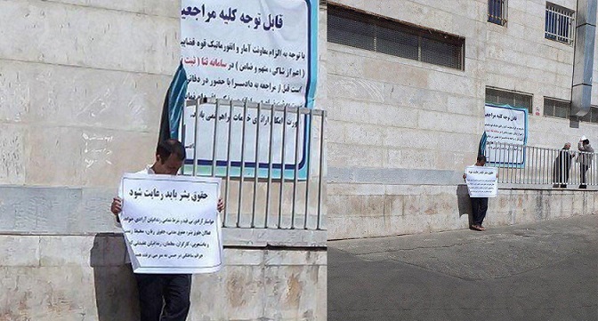 بر روی پلاکارد این شهروند نوشته شده بود “خواستار رعایت حقوق بشر و آزادی زندانیان آزادیخواه، کارگران، معلمان، فعالان مدنی و همه زندانیان عقیدتی که به ناحق در زندانند هستم”