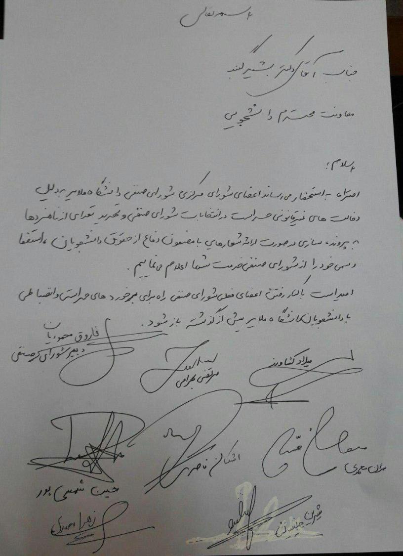 اعضای شورای مرکزی دانشگاه ملایر امروز شنبه ۲۱ اردیبهشت ۹۸ در اعتراض به دخالتهای غیر قانونی حراست و کمیته انضباطی در فراخواندن تعدادی از کاندیداهای شورای صنفی به دلیل وجود شعارهایی با مضمون دفاع از حقوق دانشجویان در پوسترهای تبلیغاتی آنان، استعفای خود را به صورت دسته جمعی تقدیم معاونت دانشجویی کردند.
