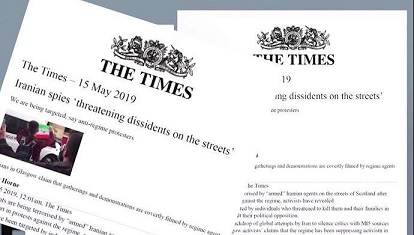 تایمز لندن ۱۵مه ۲۰۱۹، در مقالهای با عنوان جاسوسان رژیم ایران مخالفان را تهدید میکنند، می نویسد: سرویسهای امنیتی تأیید کردهاند که مأموران رژیم ایران جاسوسی و نفوذ میکنند و تلاش میکنند گروههای اپوزیسیون در بریتانیا را متوقف کنند اما این اولین بار است که مخالفان درباره تاکتیکهای رعب و تهدید در اسکاتلند علناً شکایت کردهاند.