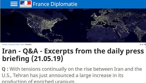 وزارتخارجه فرانسه در بریفینگ روزانه در پاسخ به سؤالی در رابطه با تولید ظرفیتهای غنیسازی اورانیوم توسط رژیم ایران گفت: ما متوجه اعلام های اخیر مقامات رژیم ایران در رابطه با تولید ظرفیتهای غنیسازی اورانیوم که همسو با بیانیههای ۸مه آنها بود شدهایم.