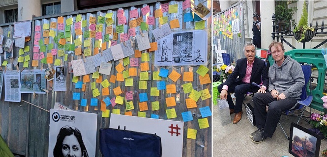 ريچارد چادر كوچكى در مقابل سفارت گذاشته و تا اطلاع ثانوى روزها و شبهايش را آنجا مىگذراند. تحصن مسالمت آميز و تاثيرگذار ريچارد موجى از همراهىها و همدلىهاى مردمى ايجاد كرده و مورد توجه گسترده رسانههاى محلى و بينالمللى قرار گرفته است. حصار فلزى كه مسىئولان سفارت در كمال سنگدلى و از قرار معلوم براى آزار و ارعاب ريچارد نصب كردند اكنون مملو از پيامهاى دلگرم كننده و اميدبخش شده است، پيامهايى كه در آن افراد آرزو كردند نازنين آزاد و با دخترش به انگلستان باز گردد. و آخرين نكته جالب اينكه ريچارد تعدادى نامه از سوى مردم به آدرس «چادر در پياده رو مقابل سفارت جمهورى اسلامى ايران» دريافت كرده است! اگر ساكن لندن هستيد، ريچارد را تنها نگذاريد. به او سر بزنيد و از اعتراض او به بى عدالتى حمايت كنيد.