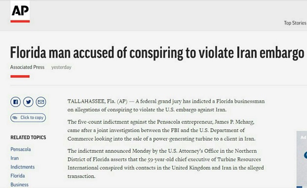 به گزارش خبرگزاری آسوشیتدپرس دولت آمریکا بامداد امروز سهشنبه اول مرداد نود و هشت یک دلال رژیم ایران را در فلوریدا به نقض تحریمها متهم کرد. بعد از تکمیل تحقیقات پلیس اف.بی.آی و وزارت بازرگانی آمریکا، هیأت منصفه «جیمز مهارگ» را به جرم فروش توربینهای تولید قدرت به عوامل رژیم ایران متهم کرد.